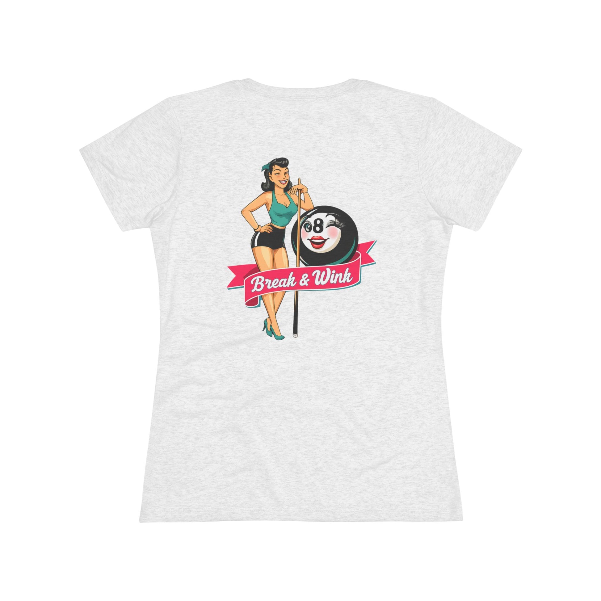 Light, drapey, and a little cheeky — this slim-fit women's tee feels like it was made for weekend lanes and post-game hangs. The soft triblend fabric skims the body without clinging, letting the vintage pin-up and playful “Break & Wink” graphic on the back take center stage. Wear it tucked into high-waisted jeans after a morning league, or throw it on between shifts at the alley. The small chest logo reads “CUL CREW” in soft pink, while the back art brings a retro, competitive-squad energy that reads confident, fun, and effortlessly nostalgic.