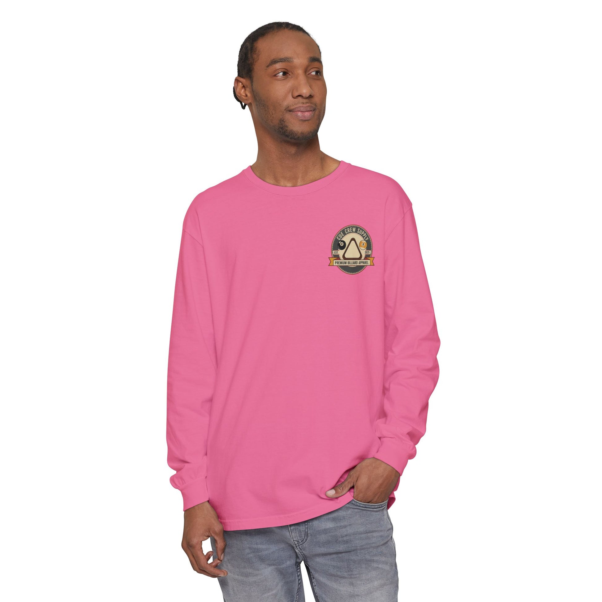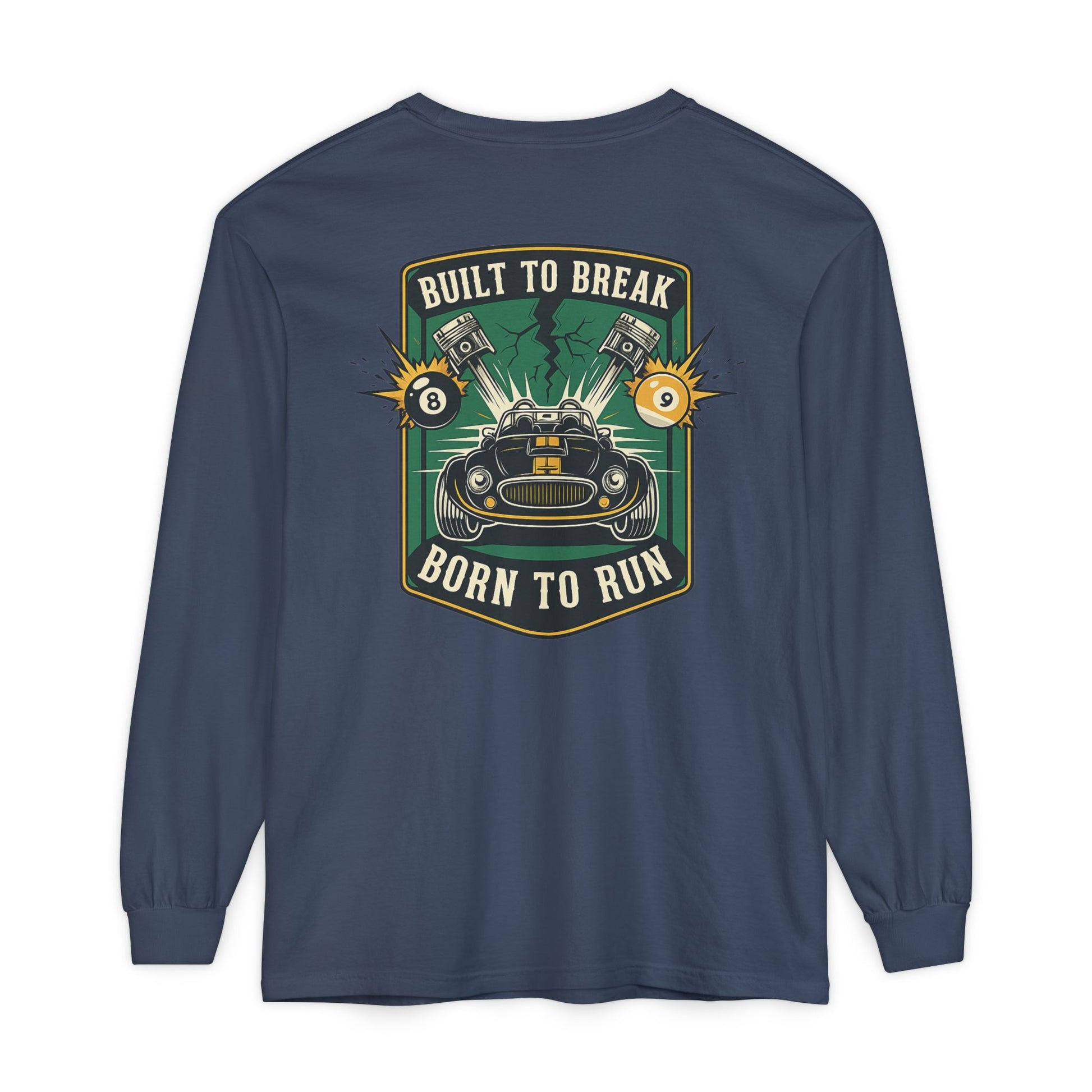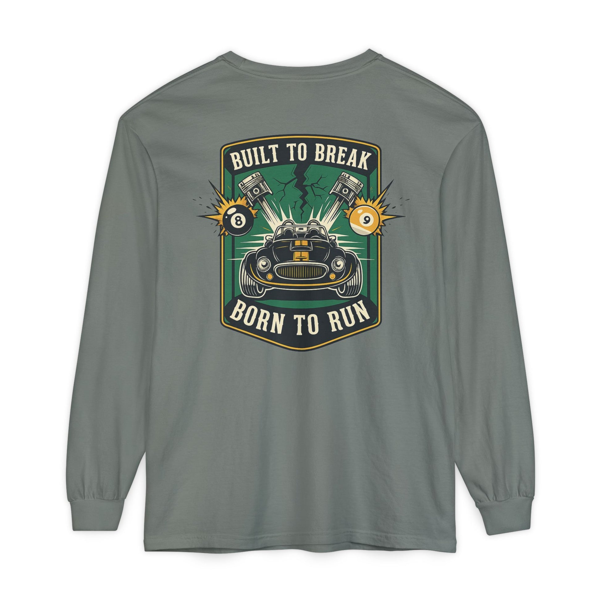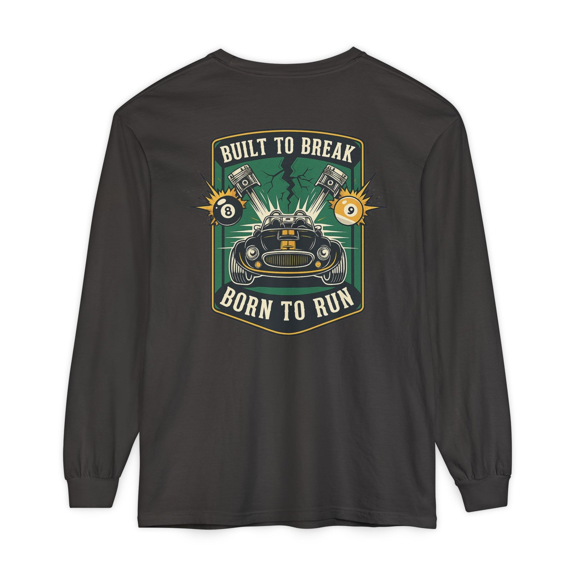 This garment-dyed long sleeve brings road-ready grit to quiet days. Soft, broken-in color and medium-weight cotton drape comfortably over the shoulders while a bold vintage racing emblem sits over the heart and a larger crest slams across the back: a snarling hot rod, pistons and sparks, and the motto “Built to Break — Born to Run.” Wear it when you’re tuning in to an afternoon of wrenching, rolling through backroads, or just wanting that lived-in racer look without fuss. The ribbed cuffs keep sleeves in place when you reach for a hood or tool, and the reinforced neck and shoulder tape mean the silhouette won’t sag after a season of hard use. It reads like a clubhouse badge — familiar to gearheads, loud without shouting.
