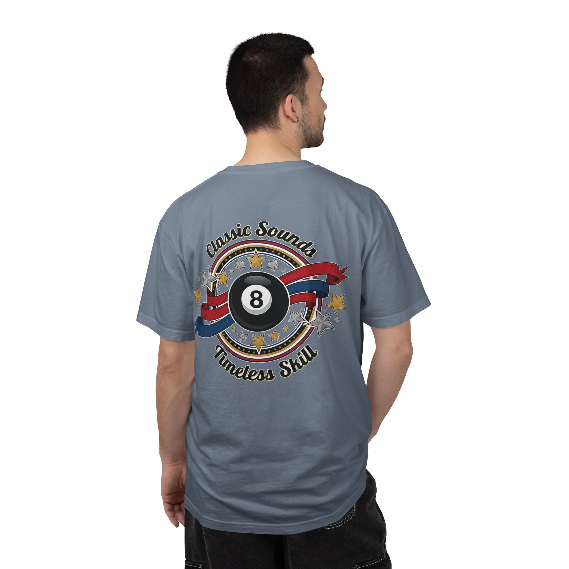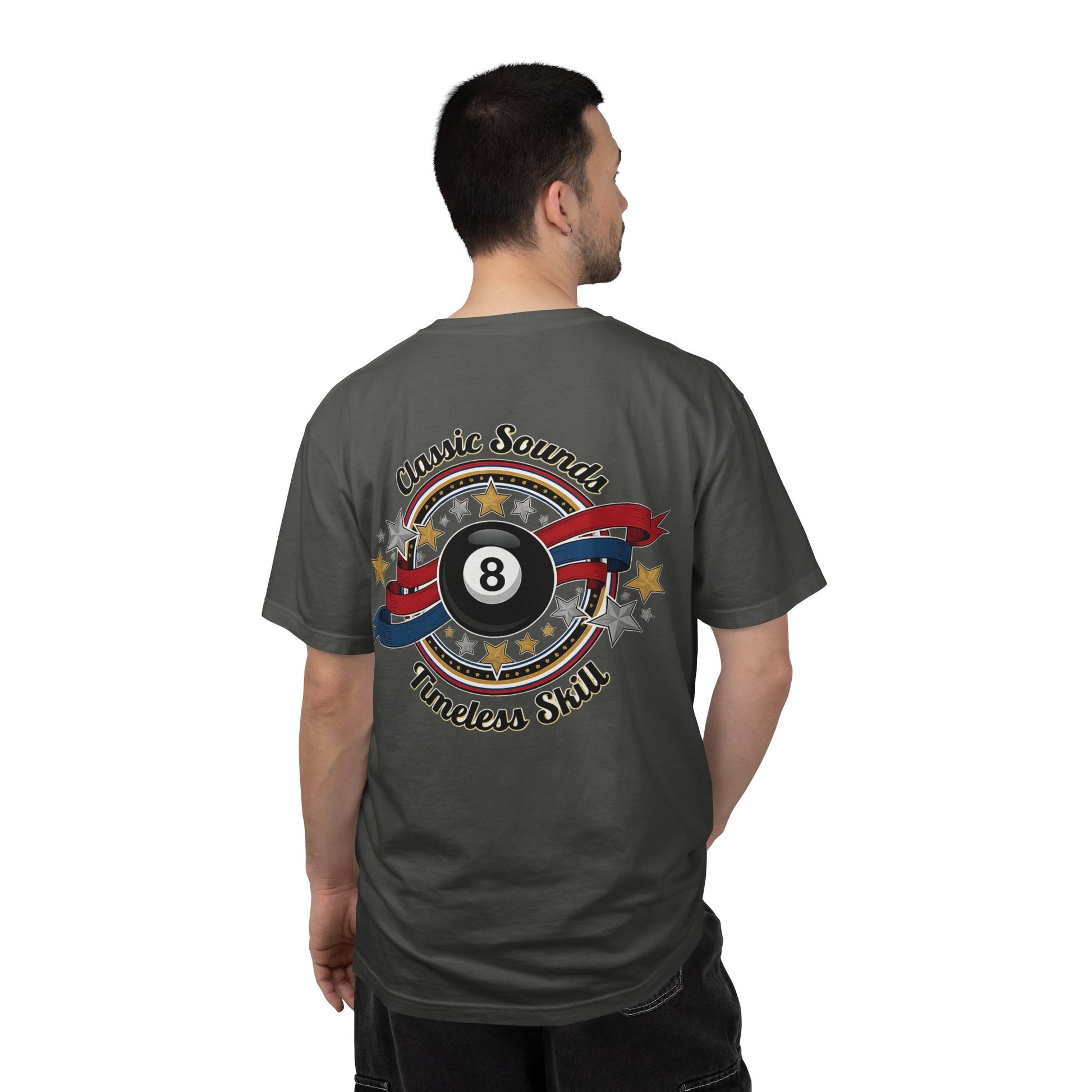 Lightweight yet sturdy, this garment-dyed tee carries a vintage pool-hall vibe — worn-in color, soft hand, and a bold graphic that celebrates cue sports. The front wears a small emblem over the heart; the back announces a classic 8-ball motif framed by stars and a ribbon that reads “Classic Sound — Timeless Skill.” It hangs with a relaxed silhouette, feels broken-in from the first wear, and layers easily under a flannel or over a long-sleeve for lane-side nights and weekend matches. This is for people who measure time in racks and runs — the shirt moves with you, holds up to long practice sessions, and looks good when you’re chalk-covered and smiling.