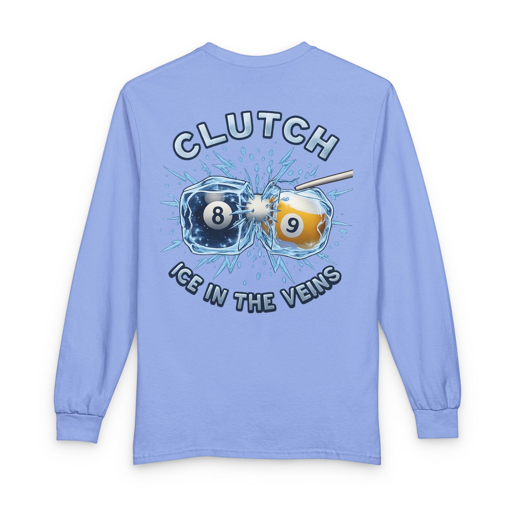 This long-sleeve tee brings pool-hall grit and cool confidence to your everyday rotation. A clean, white canvas puts a bold graphic center stage: a mid-century style crest on the chest and a larger back illustration showing an 8 and 9 ball colliding through ice with dynamic splashes. It reads like a snapshot from a late-night match—tense, focused, and a little legendary. The shirt settles softly against the skin while the ribbed cuffs and collar keep the silhouette neat. Wear it on match nights, casual hangs, or when you want to carry that steady, “ice in the veins” mindset into a regular day.