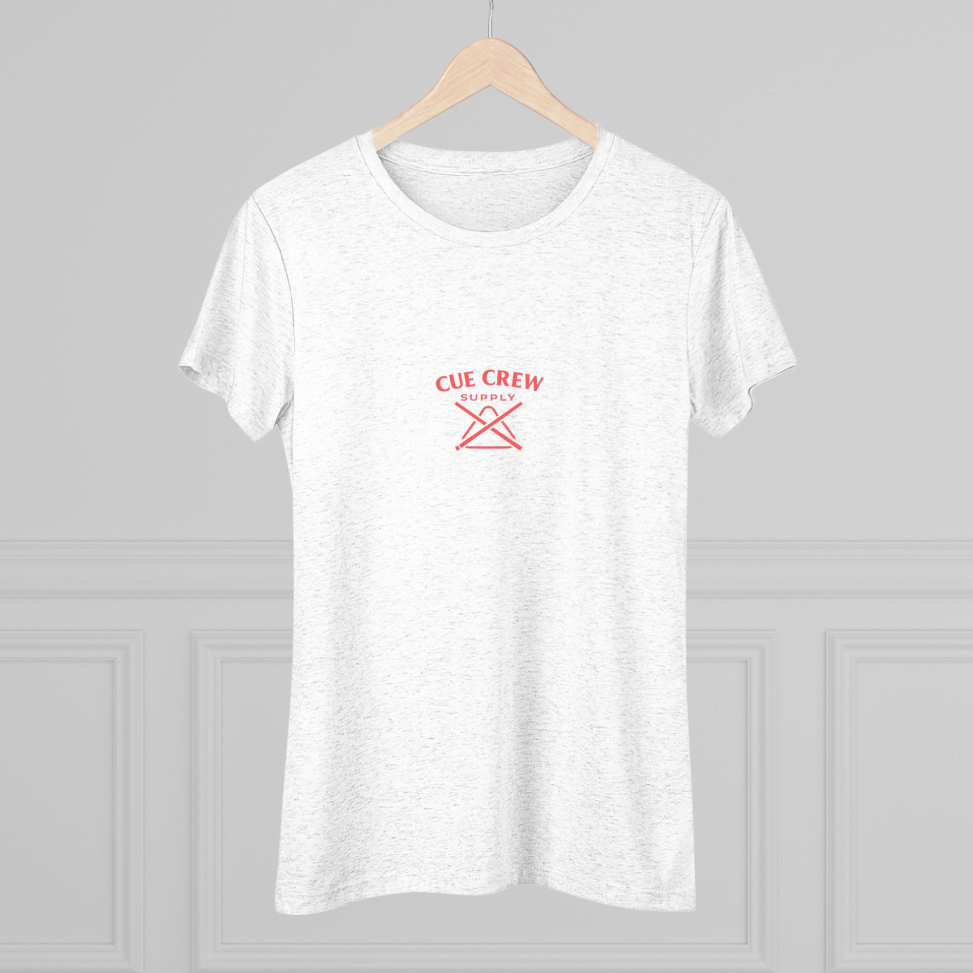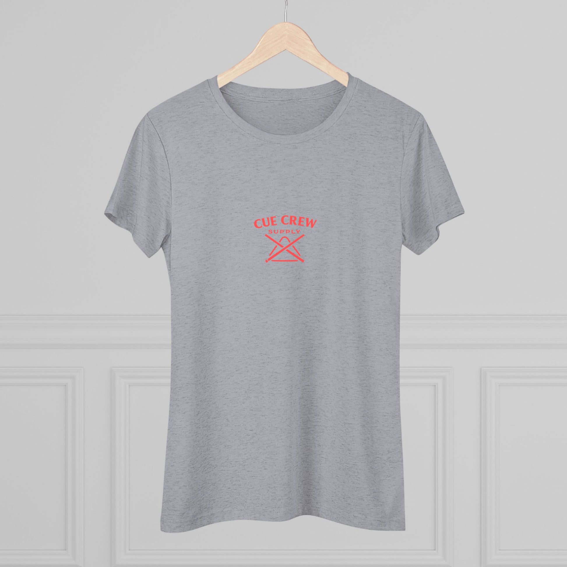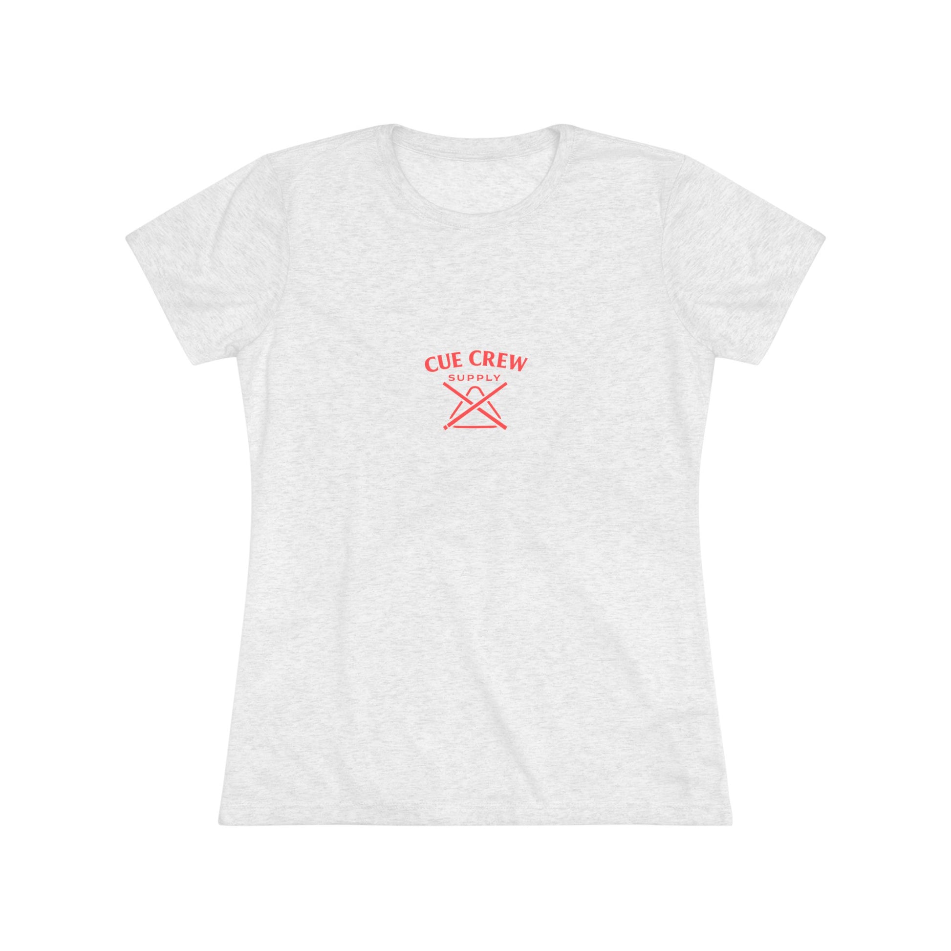 This slim-fit triblend tee feels like a second-skin from the first wear. Lightweight and drapey, it carries a bold back illustration — a strong silhouetted figure framed by flames and roses — with a small, confident chest emblem that reads “CUE CREW.” Wear it to practice, to a local match, or on coffee runs; it folds into the life of someone who moves between grit and grace. The fabric blends polyester, combed ringspun cotton, and rayon so the shirt breathes during hot drills, holds its shape after repeated washes, and hangs with a flattering, feminine cut. Subtle details — overlock side seams, shoulder and neck tape, and a ribbed collar — keep the silhouette neat and comfy. This tee speaks to people who value resilience wrapped in style, and it ages into the stories of long days, late nights, and quiet victories.