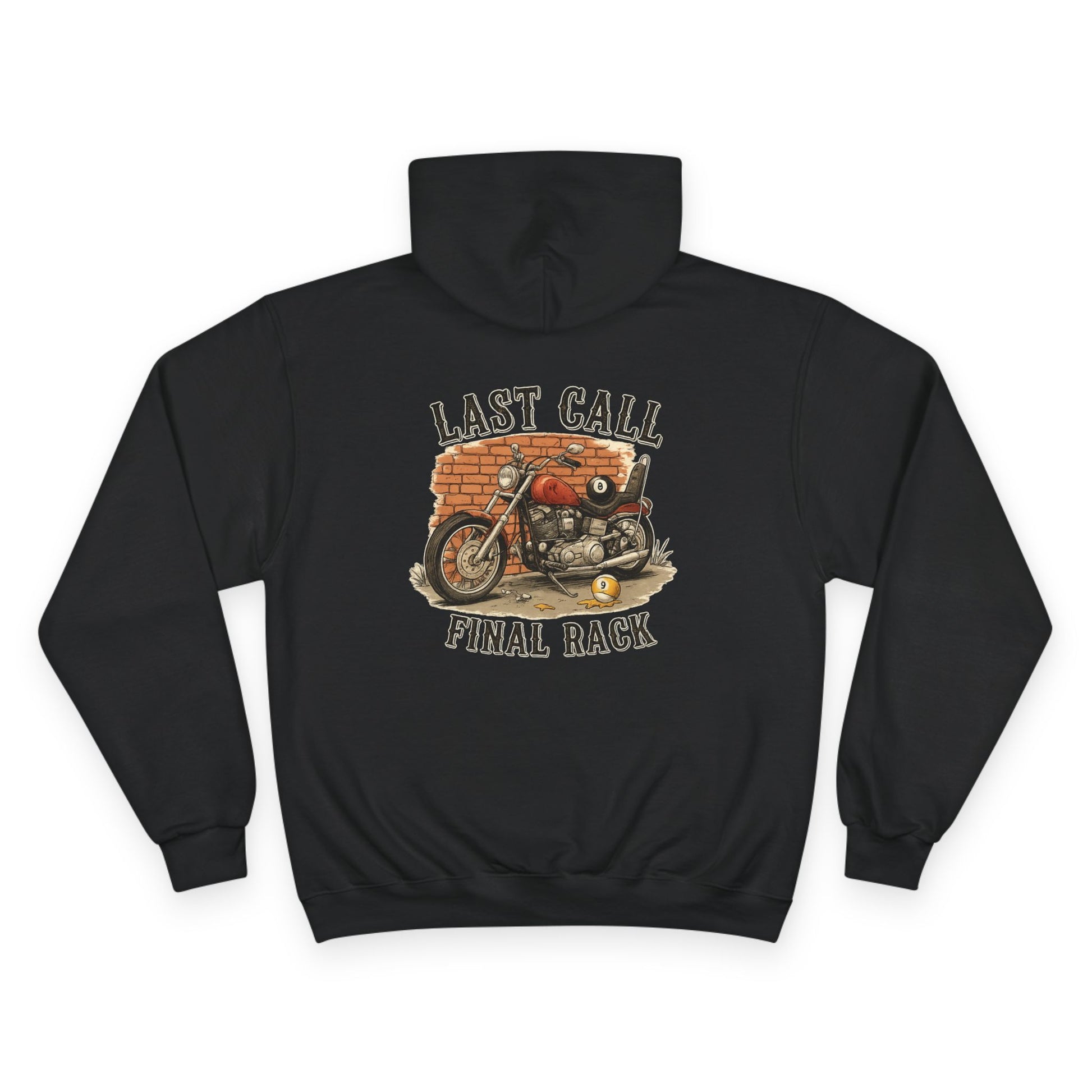 A laid-back Champion hoodie that feels like a familiar hangout and wears like a favorite memory. The front shows a vintage pool-hall emblem with crossed cues and an 8-ball, while the back carries a weathered motorcycle illustration and the phrase “Last Call — Final Rack.” Thick, slightly brushed fabric and a roomy kangaroo pocket make it comfortable for long nights at the bar, chilly garage work, or weekend rides. The midweight build holds its shape, the two-ply adjustable hood keeps wind off your neck, and the iconic Champion “C” on the sleeve signals quality without shouting. Subtle recycled fibers add an eco-minded detail, and the tubular knit gives a clean, classic silhouette that layers easily over tees or flannels.