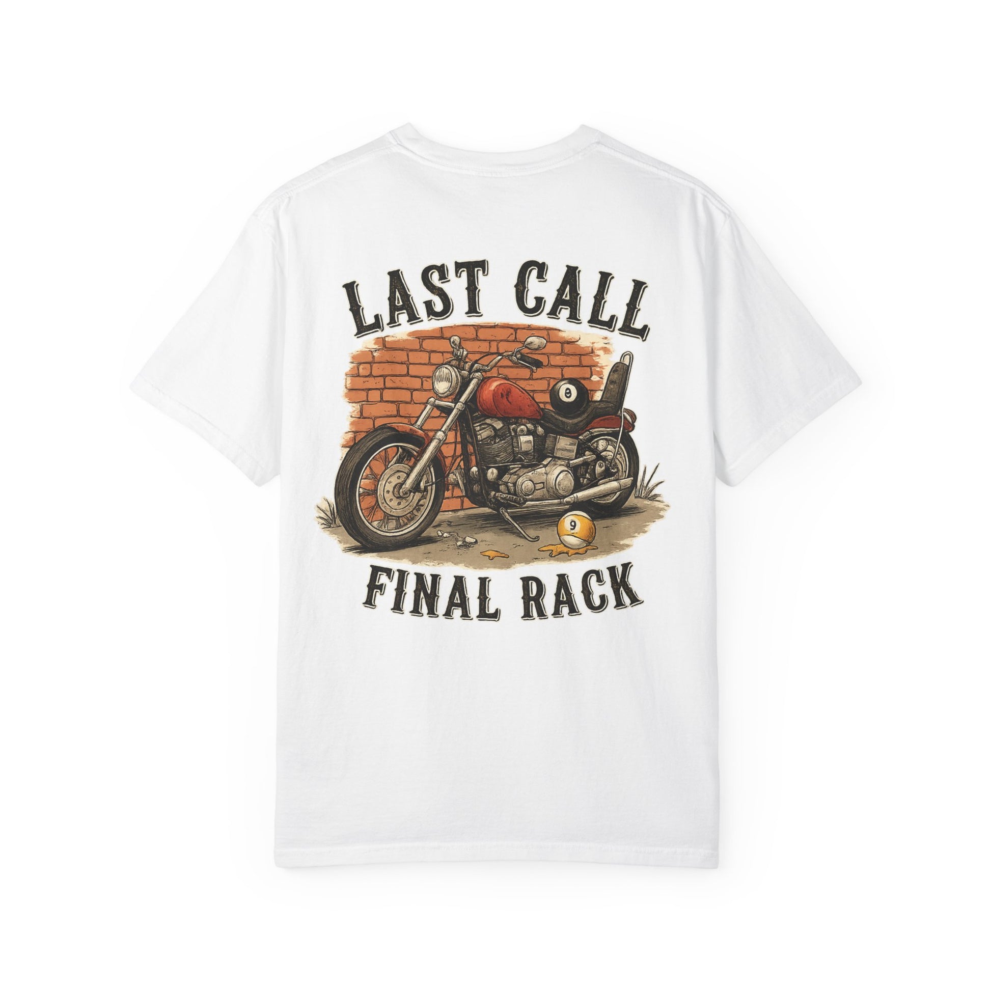 This heavyweight garment-dyed tee carries a lived-in, road-worn spirit. A retro motorcycle illustration rests against a weathered brick backdrop, framed by bold lettering that reads “LAST CALL” above and “FINAL RACK” below — a look that feels equal parts barroom anthem and open-highway sunset. The relaxed fit and soft, pre-shrunk 100% ring-spun cotton give it an easy, wearable drape that warms and fades with you. Wear it for long rides, late nights with friends, or when you want a shirt that already has stories built into its fibers.