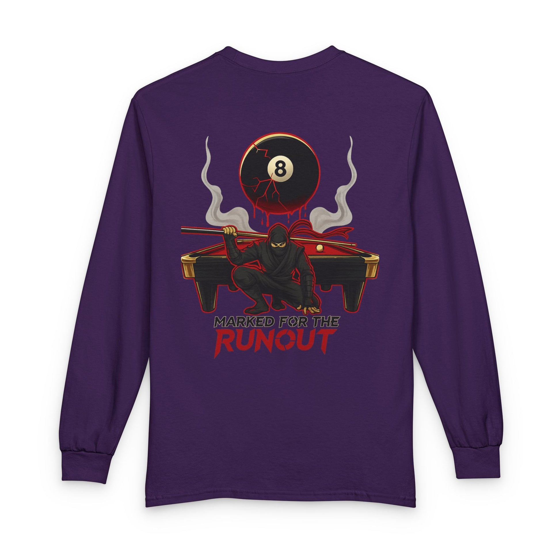 This long sleeve tee carries the pulse of late-night pool halls and the quiet focus before the break. A nod to serious players and tabletop storytellers alike, it pairs a small chest badge with a bold back illustration: a looming 8-ball, a shadowed figure poised on the felt, and the line “MARKED FOR THE RUNOUT.” Wear it on league nights, garage practice sessions, or when you want your look to say you respect the game. The cotton feels breathable and steady against the skin, the ribbed collar and cuffs hold shape after washes, and the classic cut layers easily under jackets or over hoodies without stealing the moment.