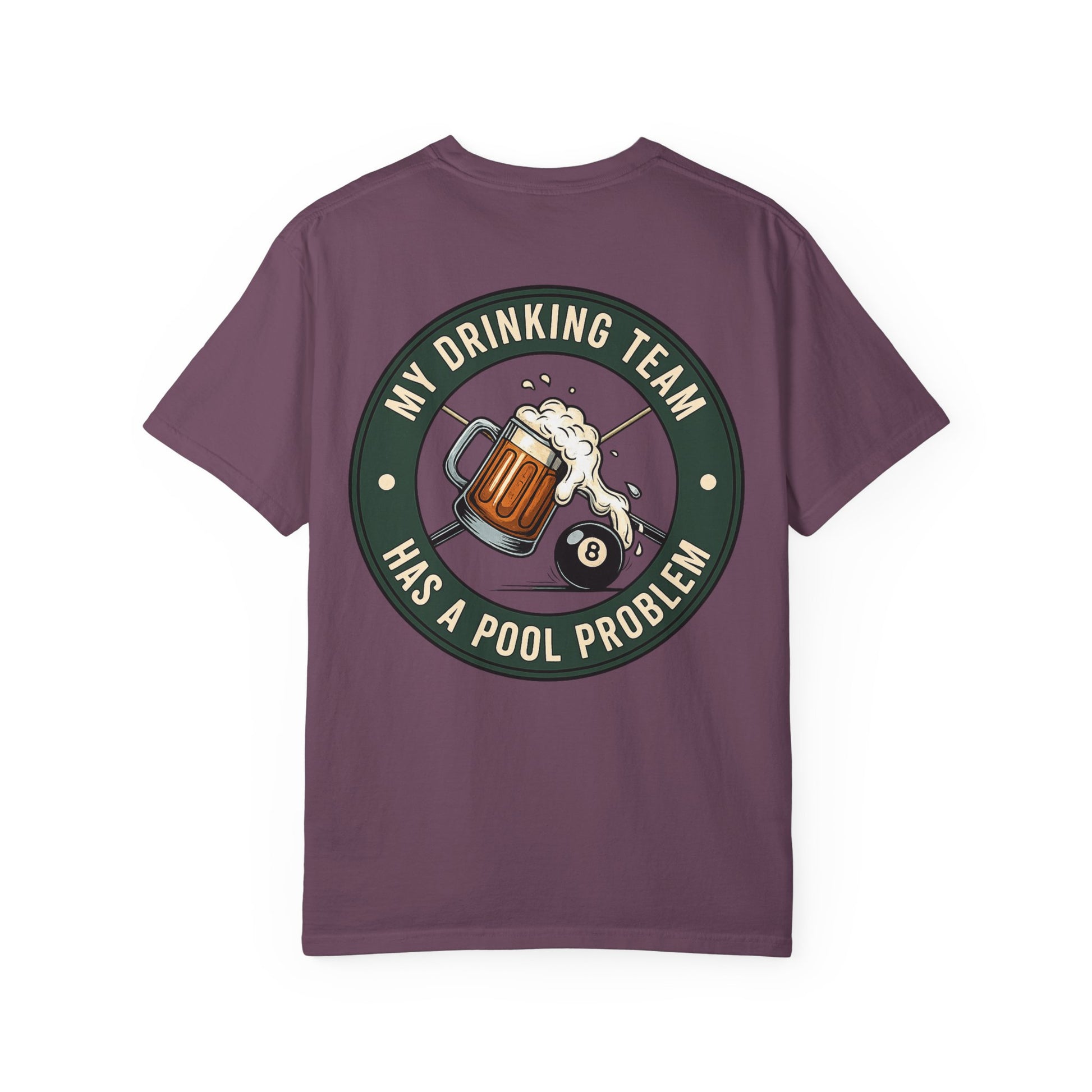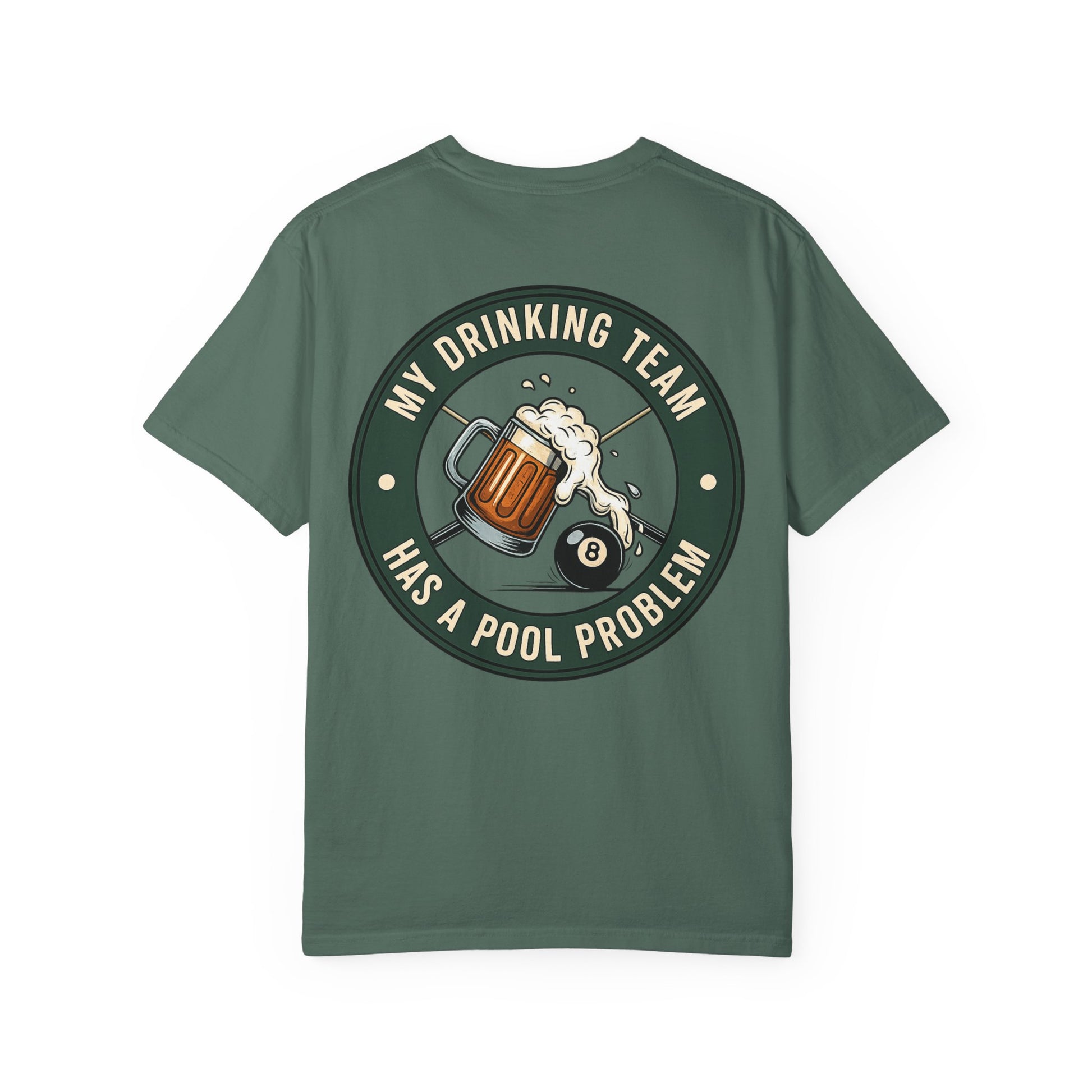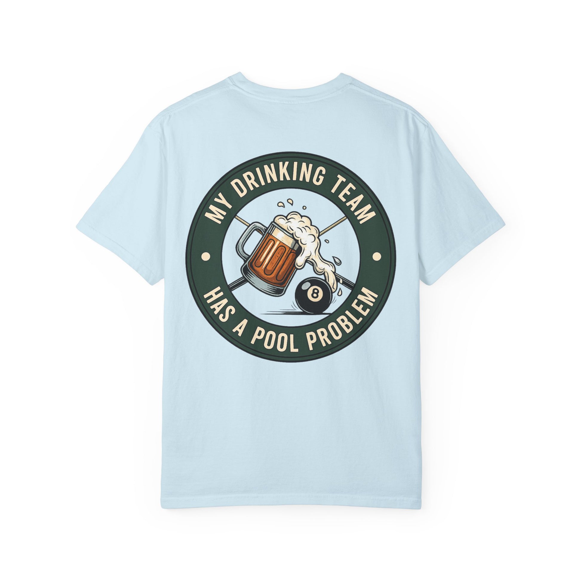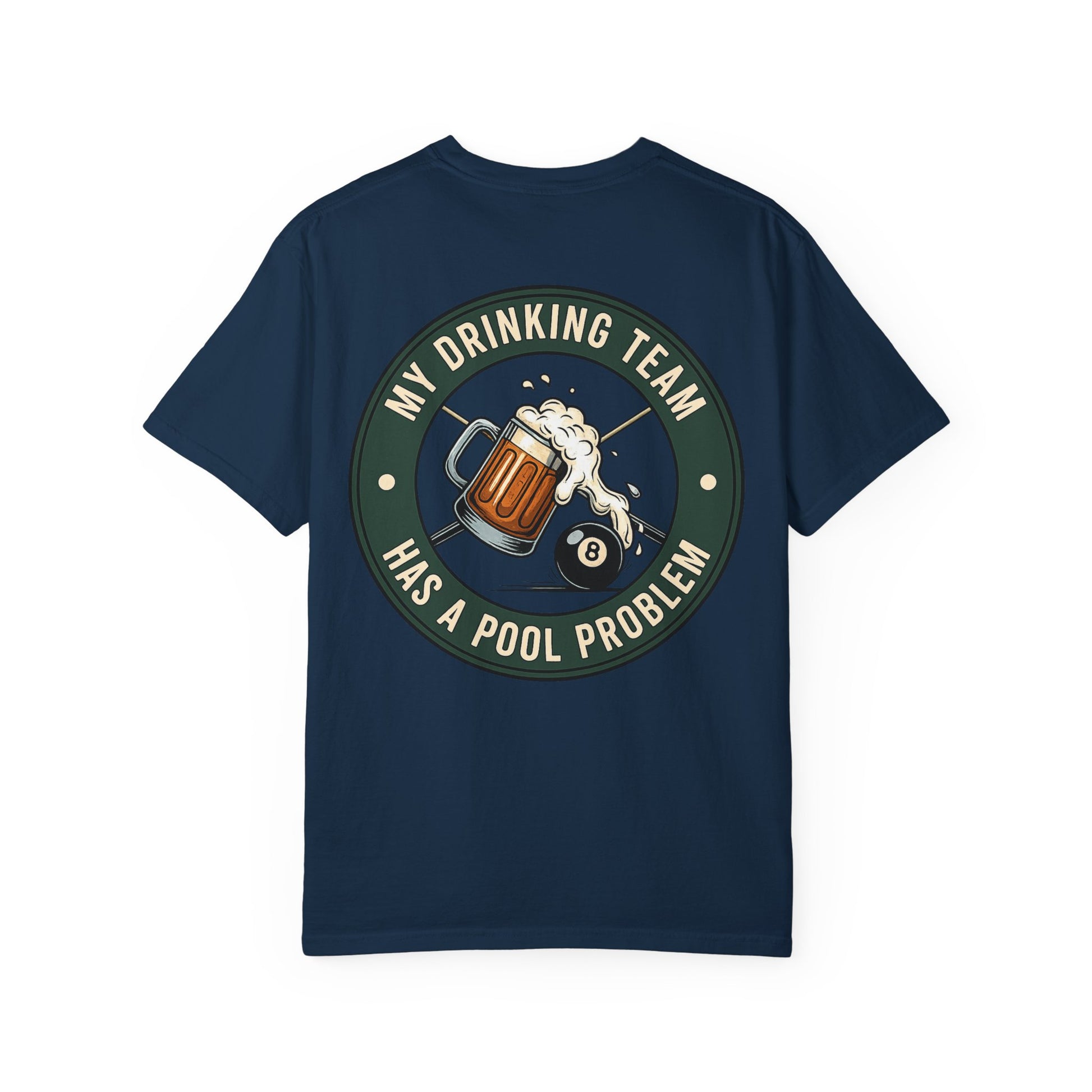 A soft, garment-dyed tee that carries a laid-back, pub-night energy. The front bears a small emblem while the back features a vintage-inspired circular patch: a frothy beer mug colliding with an 8-ball and the line “My drinking team has a pool problem.” It feels worn-in from day one — muted color, relaxed drape, and that slightly faded look that settles into your rotation. Wear it to backyard barbecues, pool hall nights, or casual weekend hangs. The shirt sits comfortably through slow afternoons and loud evenings, speaking the same easy, slightly irreverent language as friends trading stories over drinks.