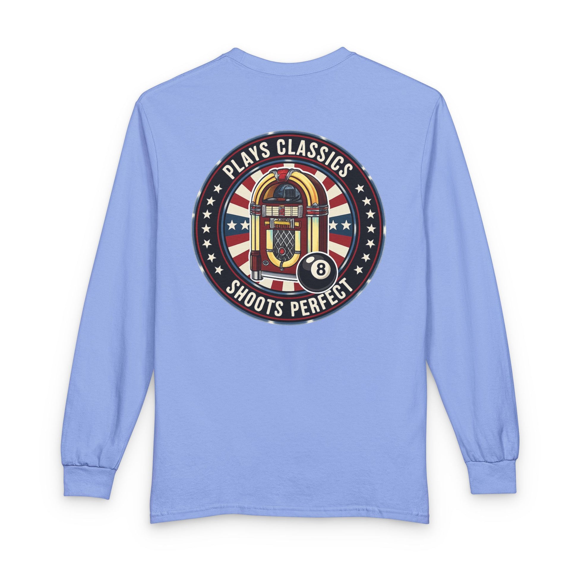 This long-sleeve shirt carries a warm, vintage diner vibe—soft white cotton as a canvas for retro artwork that nods to jukeboxes, pool halls, and Americana nights. The small chest emblem hints at a laid-back crew identity while the bold back graphic centers a classic jukebox framed by stars and stripes and an 8-ball, reading “Plays Classics, Shoots Perfect.” Wear it on cool evenings at the local bar, during pool league nights, or while spinning old records at home. The fabric and fit keep the focus on comfort: sleeves that sit right at the wrist, a roomy classic cut, and a collar that holds its shape through repeat wears. This is for people who collect memories around neon lights and vinyl crackle—those who appreciate well-worn sounds and friendly competition.