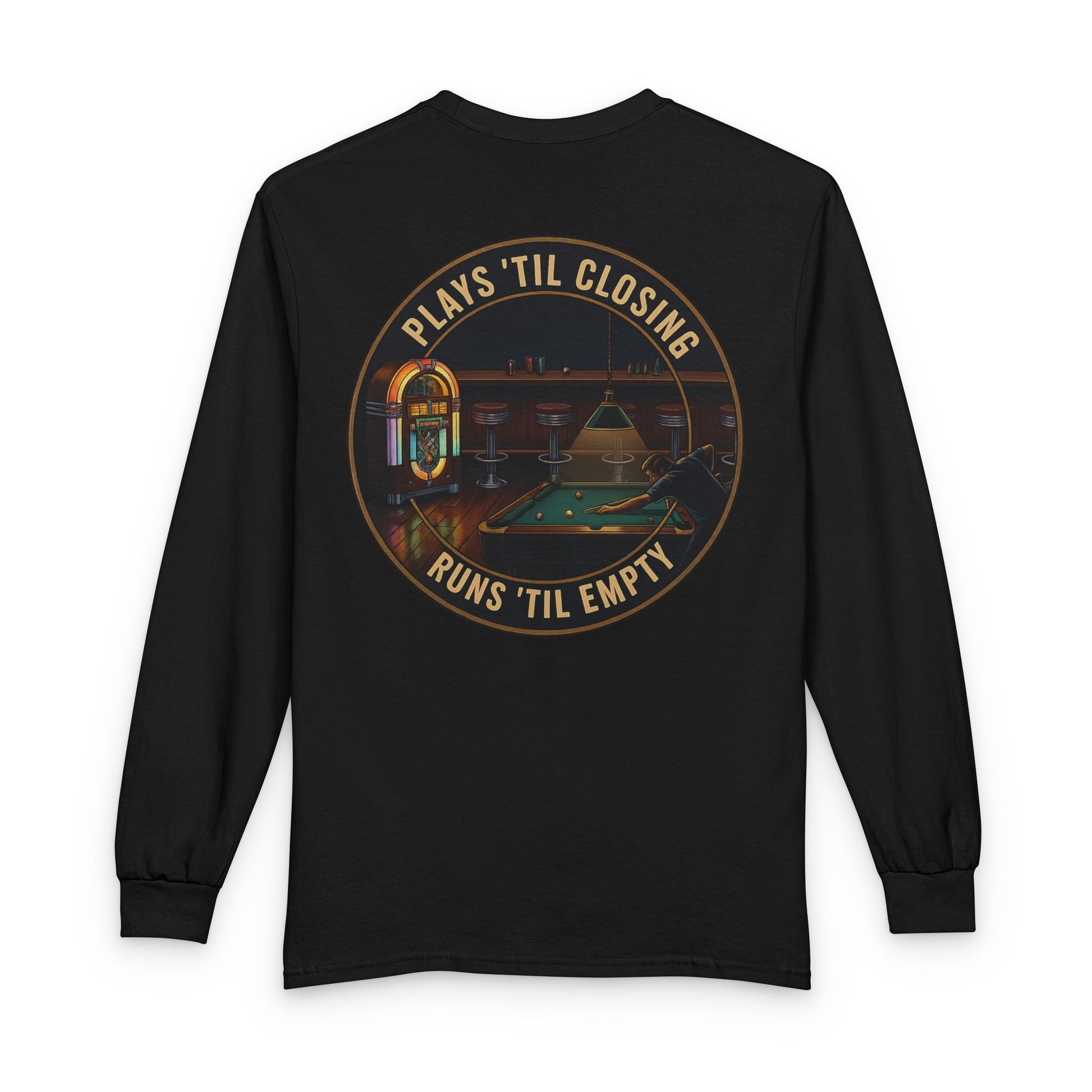 This long-sleeve tee carries the warm buzz of a late-night pool hall — low lights, a glowing jukebox, felted cues, and the steady click of balls. It slips on like a comfortable companion for evenings spent chasing the last rack or catching up with friends over slow rounds. The small chest emblem gives a nod to the scene; the larger back art drops you into the room: vintage tones, cozy shadows, and the tagline that keeps the night rolling. Wear it when you want an understated piece that reads like a shared memory — familiar, relaxed, and quietly proud of its lane-side stories.