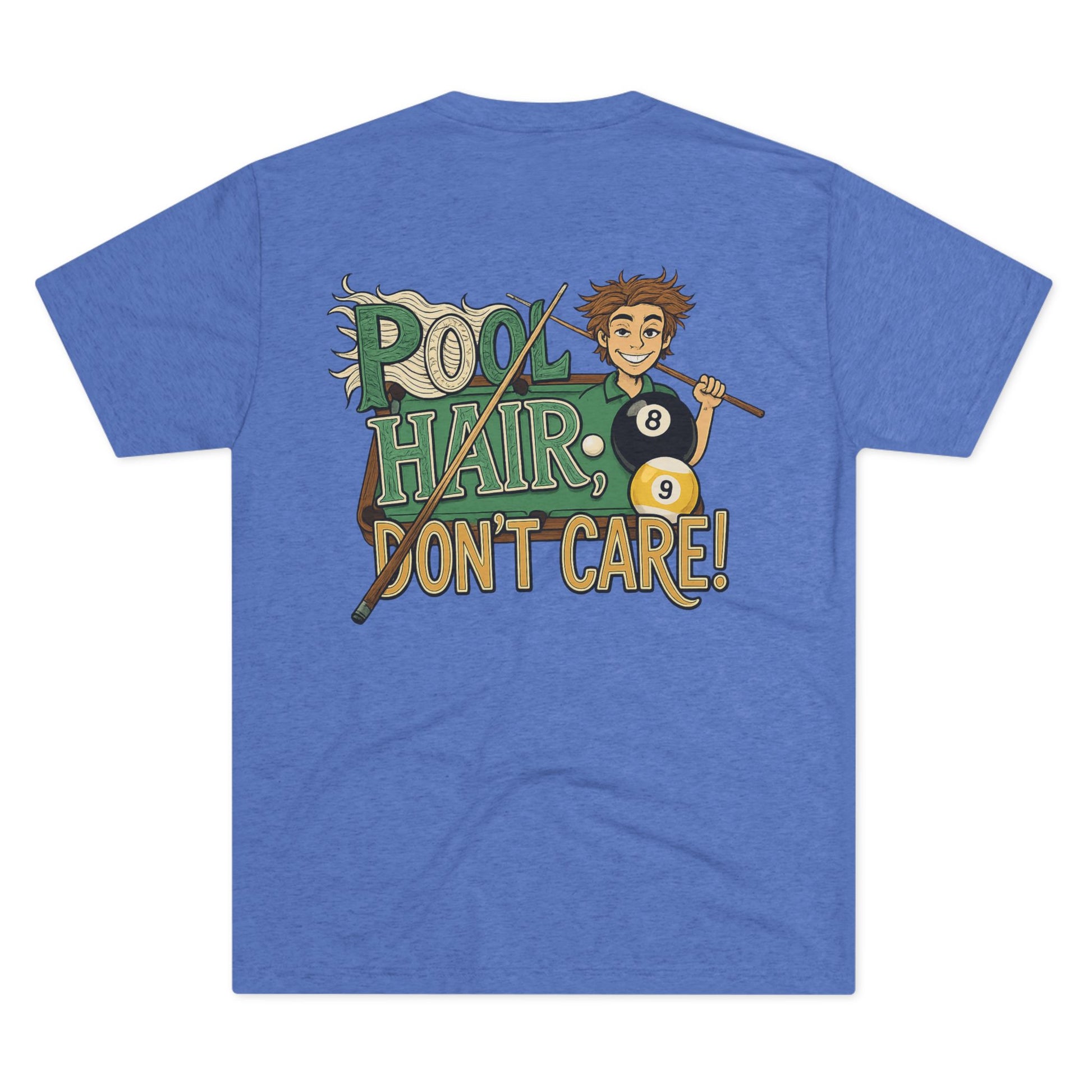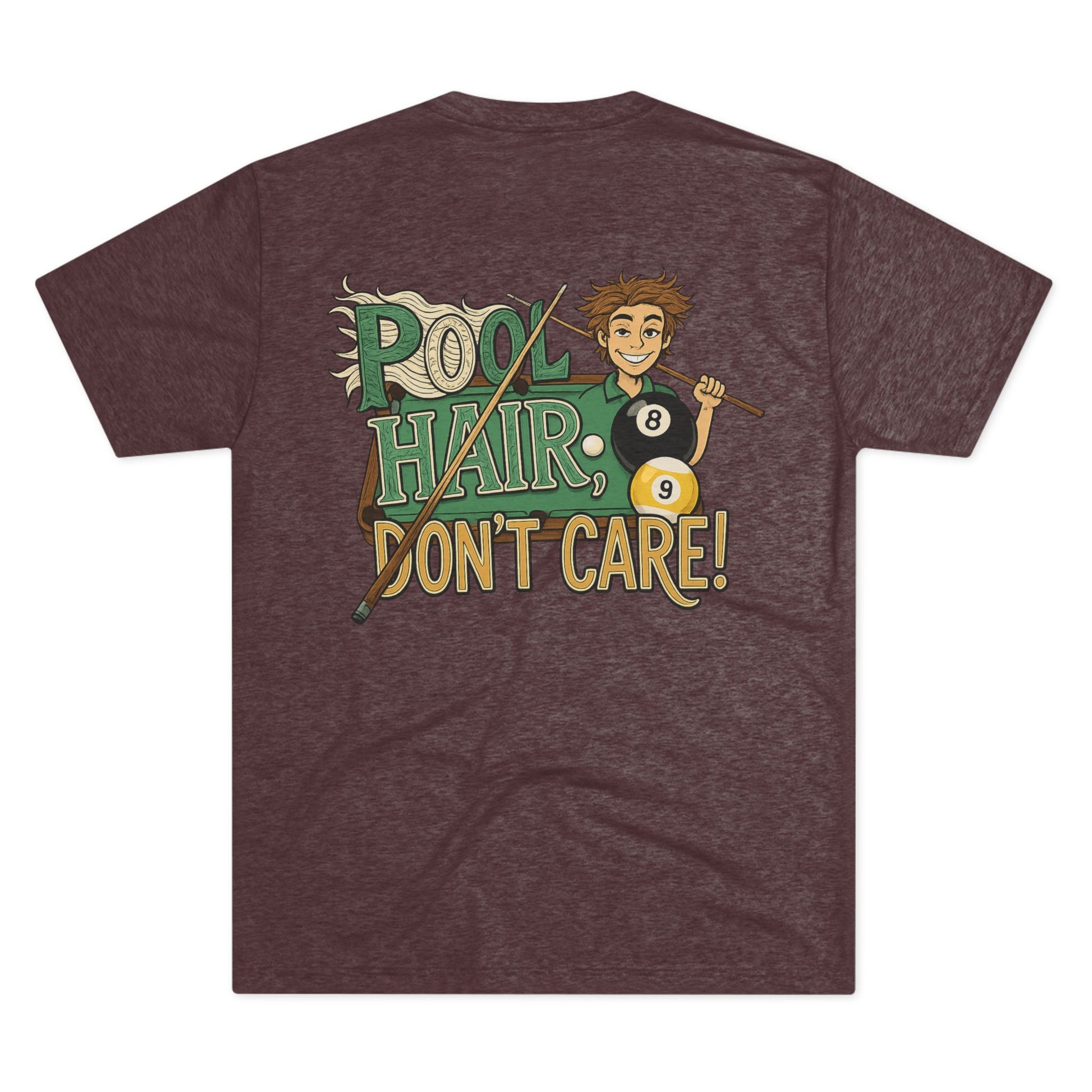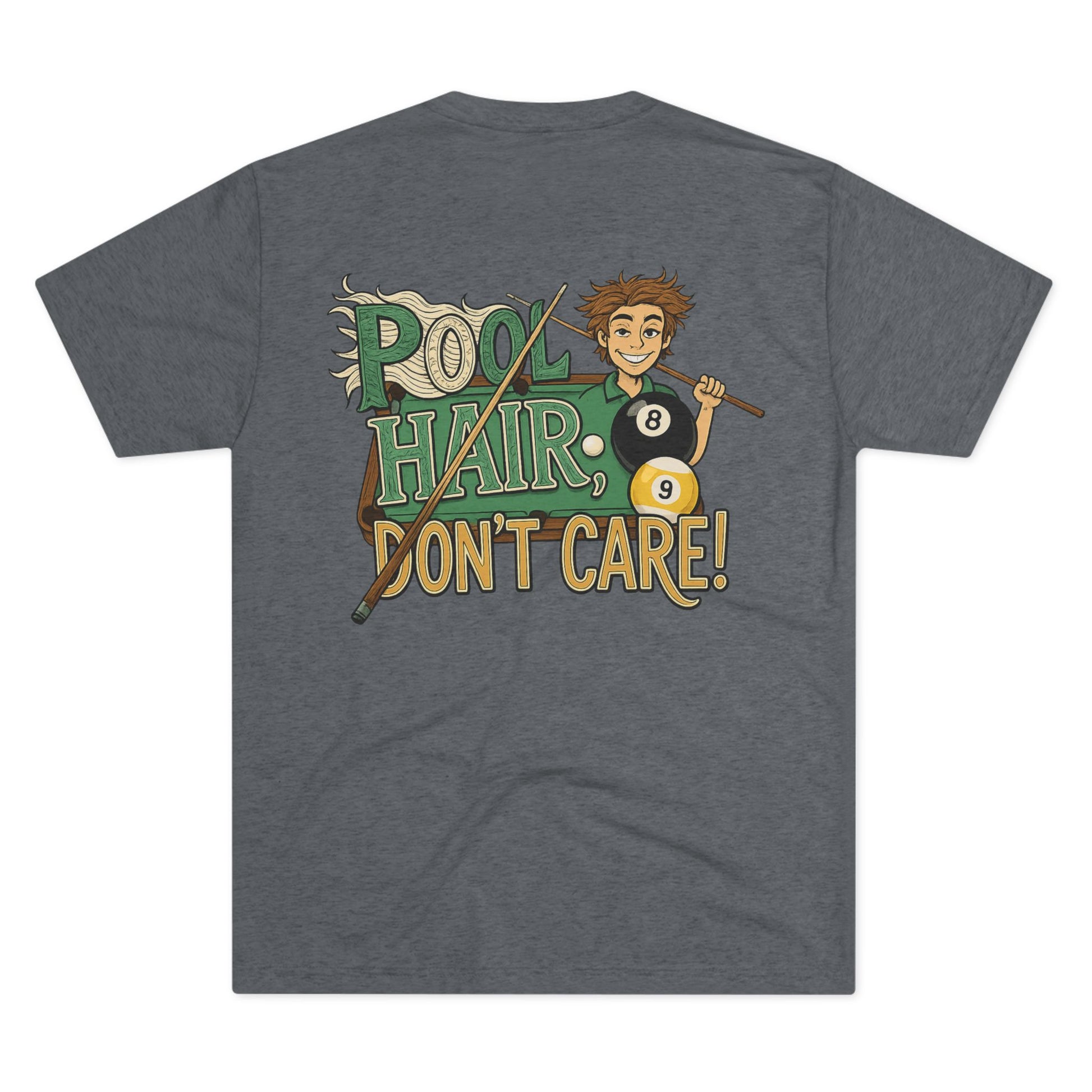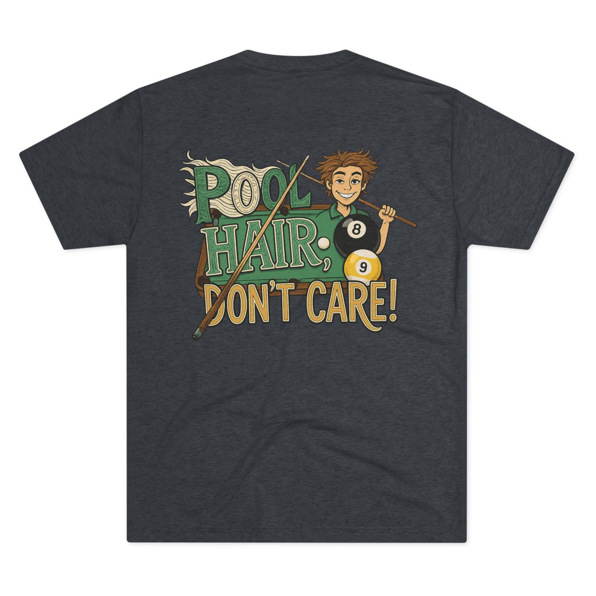 Light, lived-in, and full of personality — this tri-blend crew brings the casual energy of the pool hall to everyday wear. Soft drape and a featherweight feel make it easy to reach for after a long match or when you’re heading out with friends. The playful “Pool Hair, Don’t Care!” artwork on the back keeps the vibe fun and unpretentious: cue stick in hand, scattered billiard balls, and that grin that says you’d rather sink the eight than fuss with your look. Wear it with worn jeans, hooded flannels, or under a denim jacket for laid-back nights downtown or lazy weekends shooting pool with the crew.