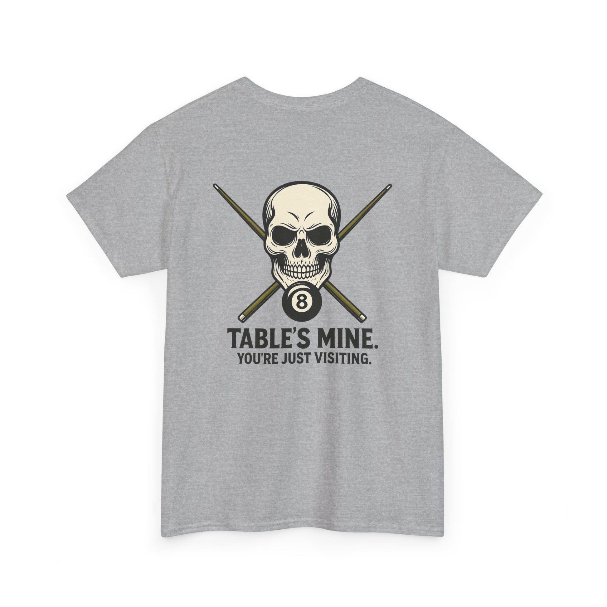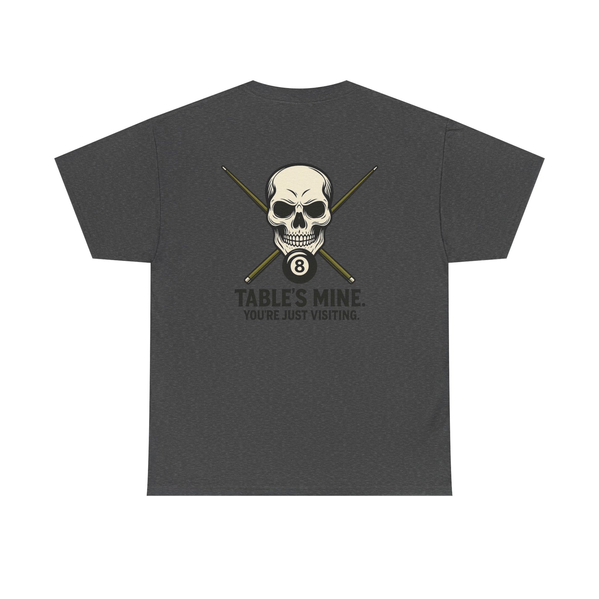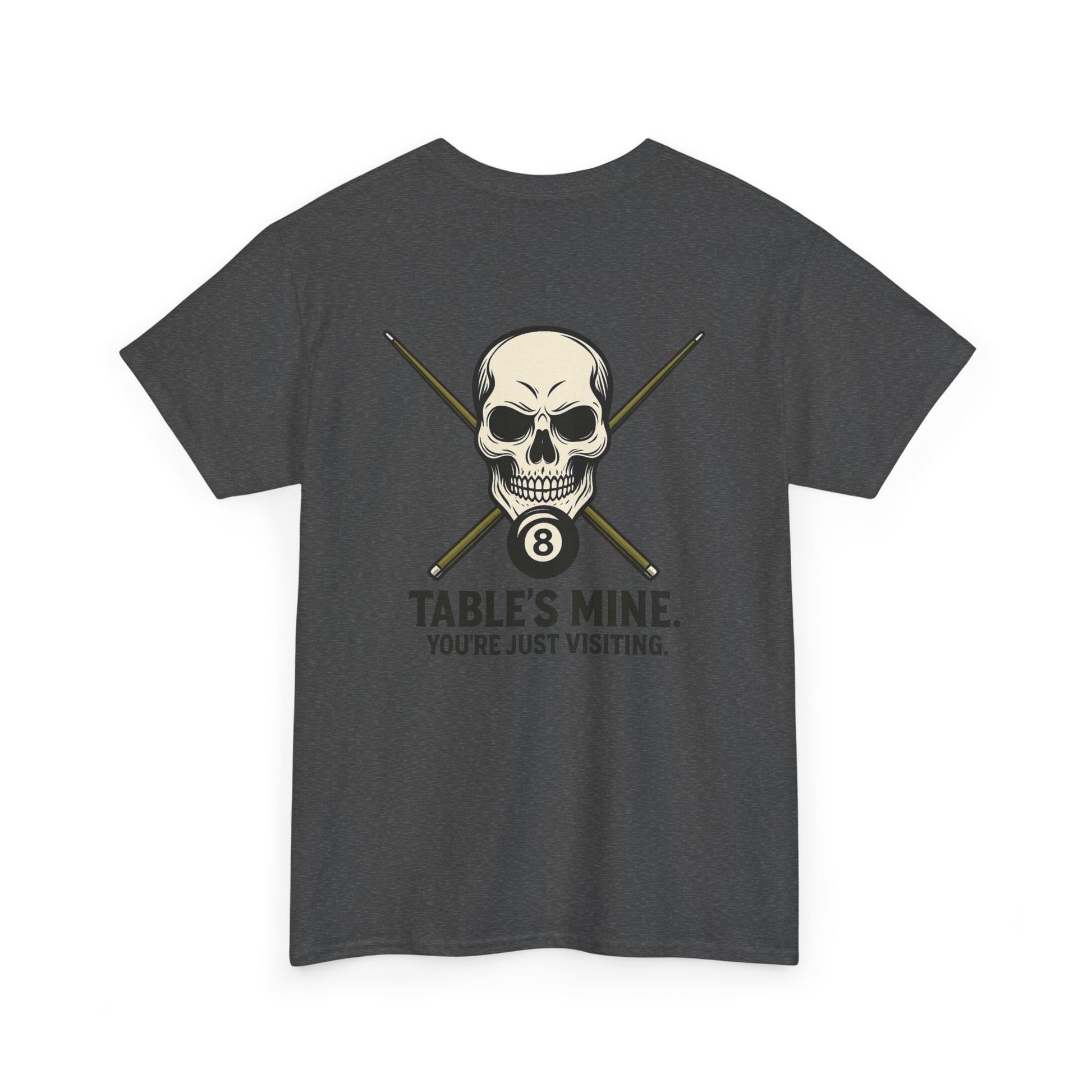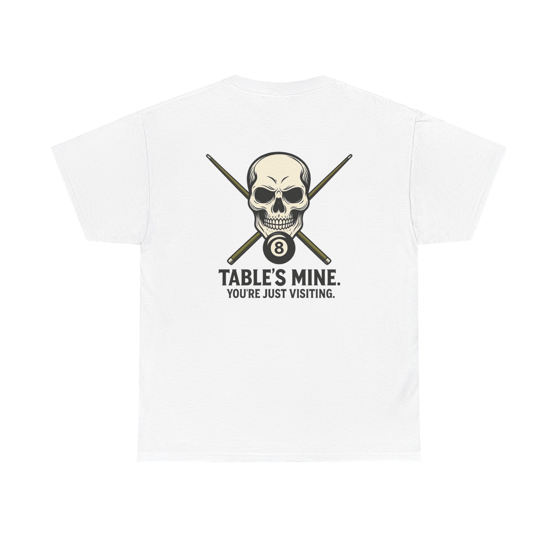 Own the room—and the table—with this unapologetically fierce tee featuring a stylized skull, crossed pool cues, and the iconic 8-ball. Beneath it all, the message is clear: "TABLE'S MINE. YOU'RE JUST VISITING." Whether you're racking up wins or just vibing with the crew, this shirt speaks your language: competitive, confident, and cool.