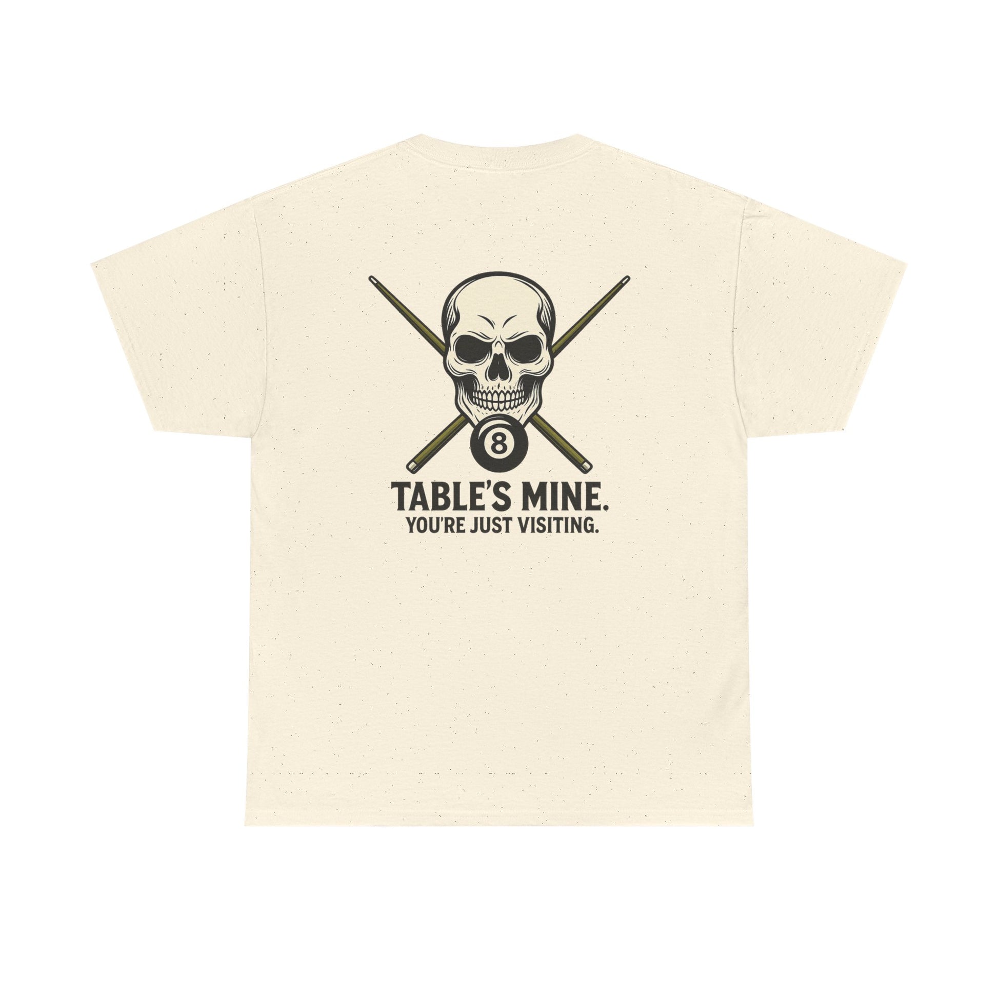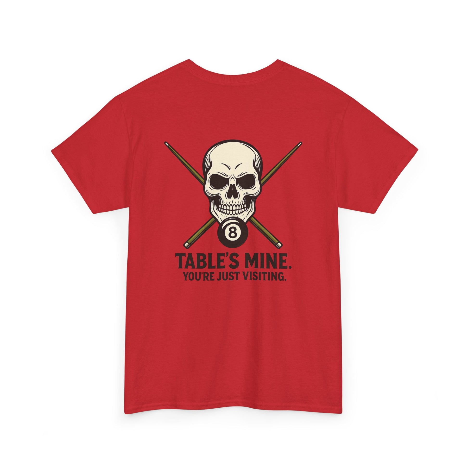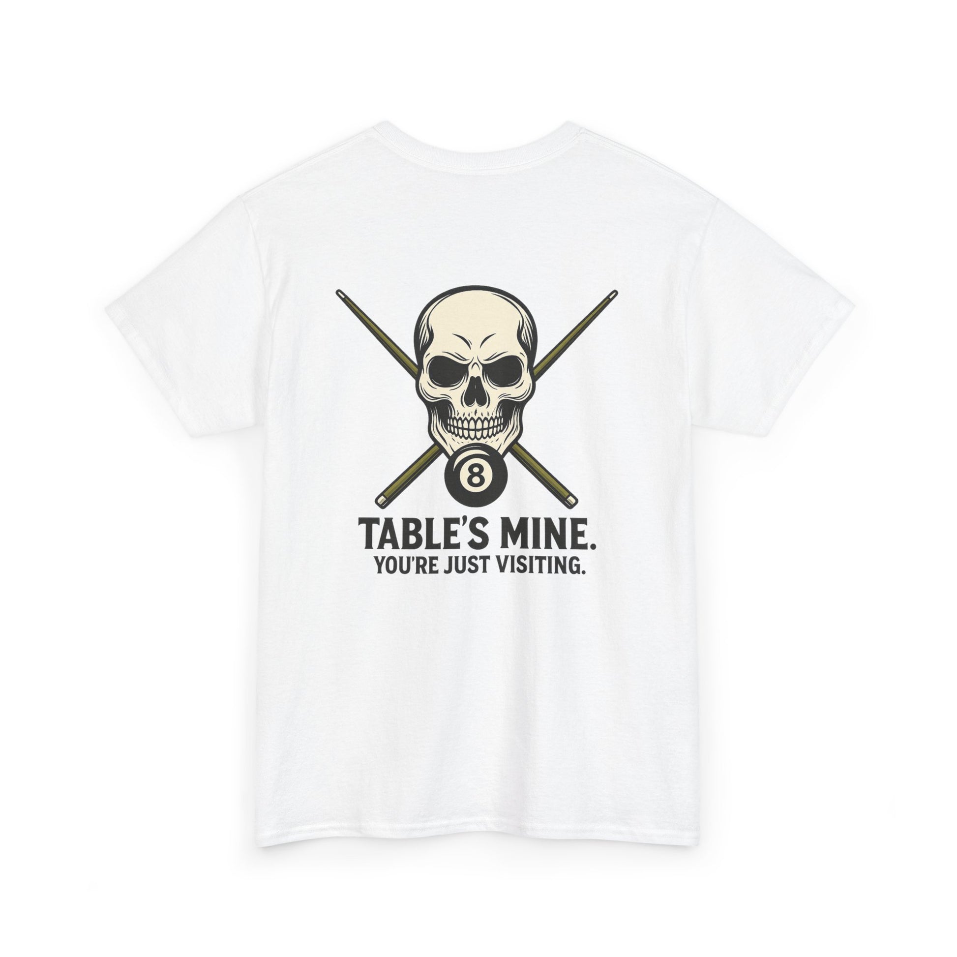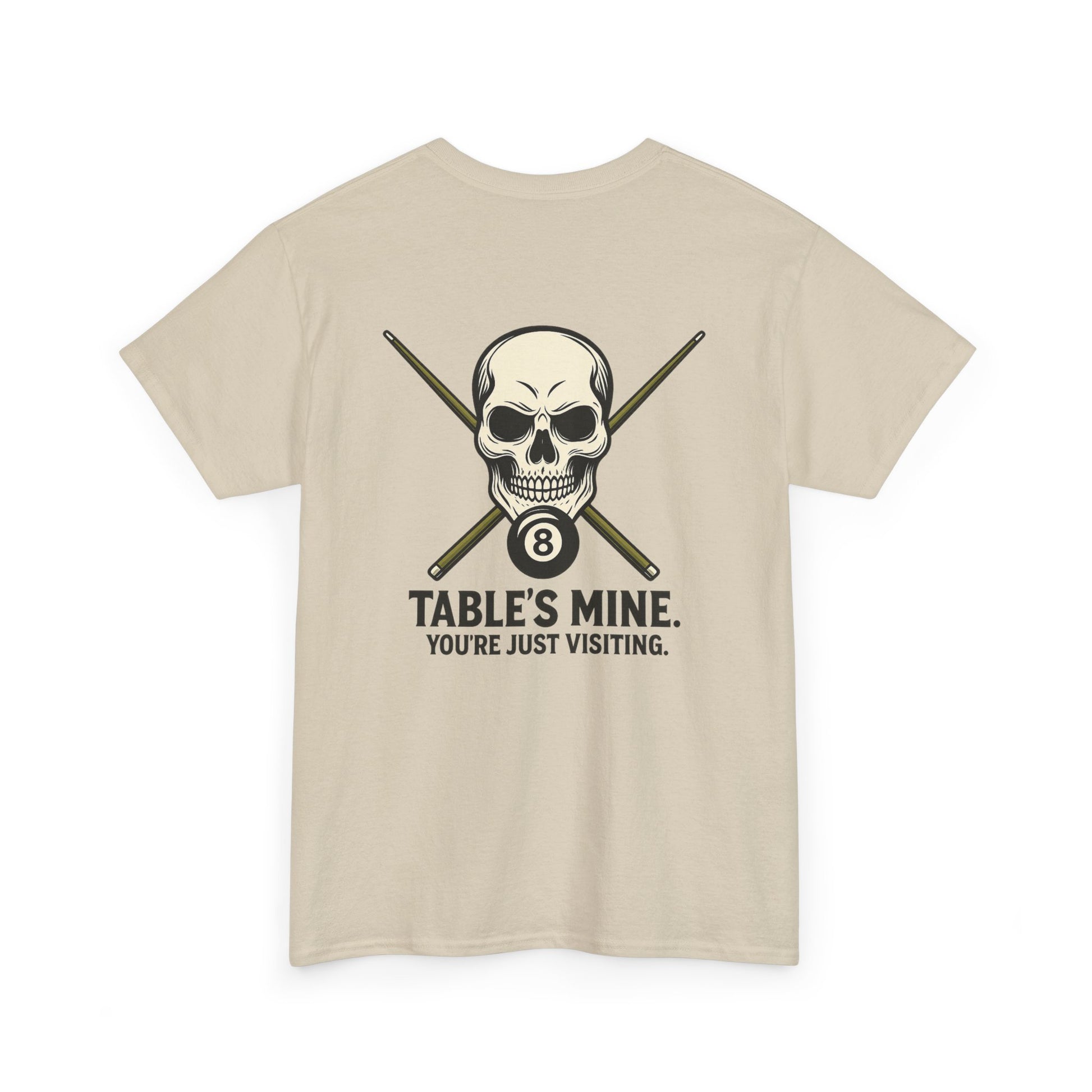 Own the room—and the table—with this unapologetically fierce tee featuring a stylized skull, crossed pool cues, and the iconic 8-ball. Beneath it all, the message is clear: "TABLE'S MINE. YOU'RE JUST VISITING." Whether you're racking up wins or just vibing with the crew, this shirt speaks your language: competitive, confident, and cool.