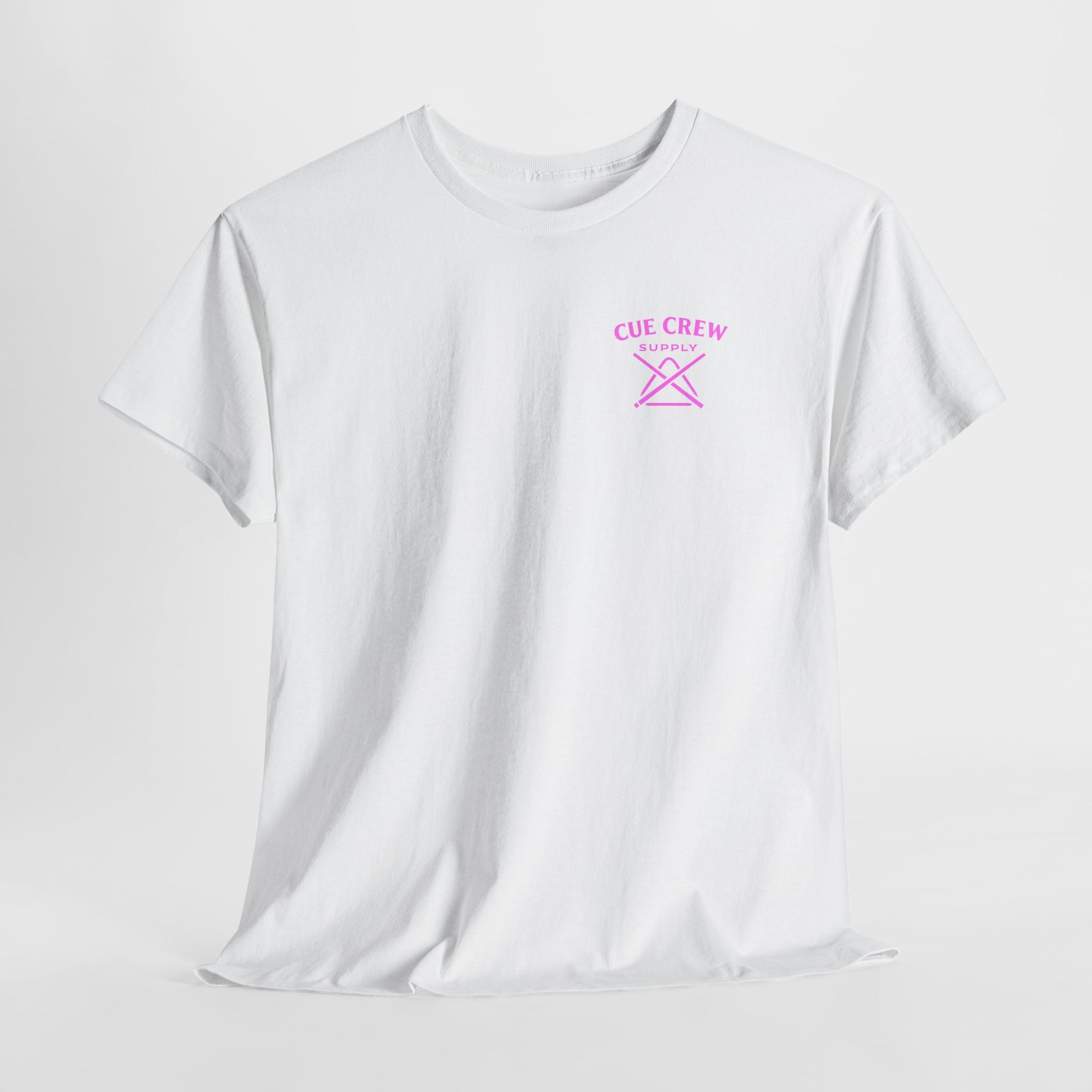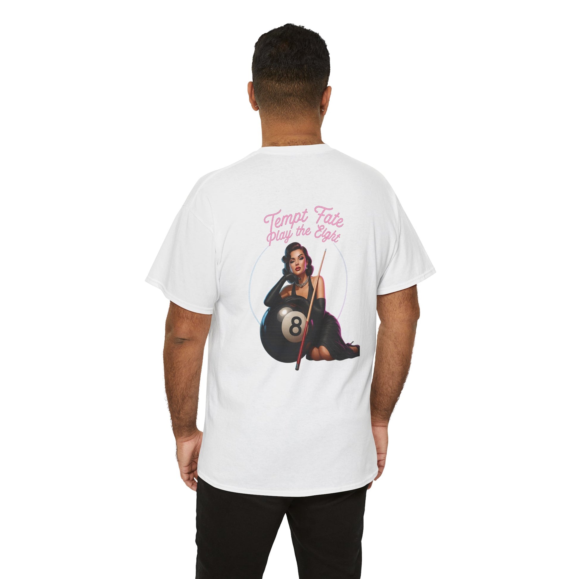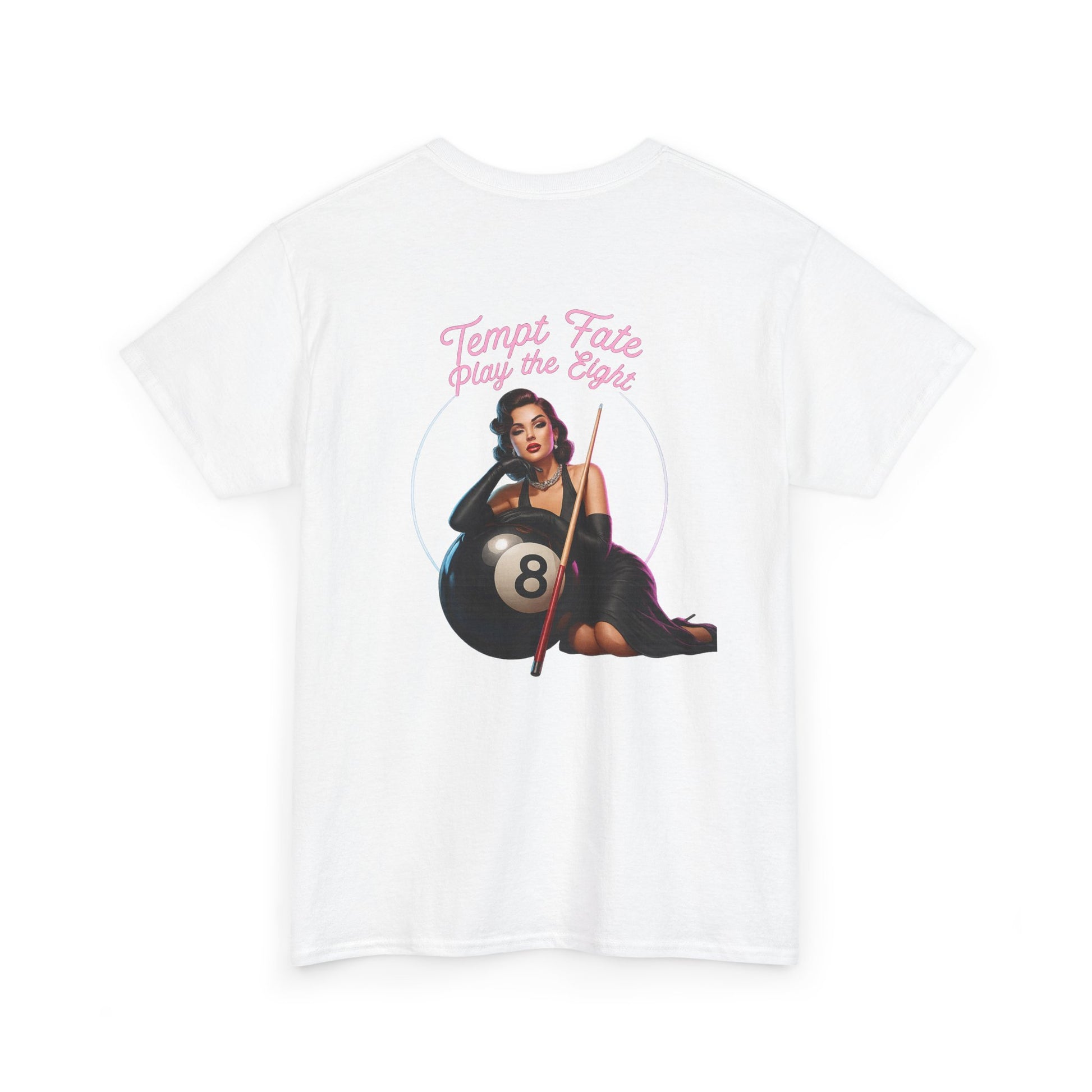 White classic-fit tee with a vintage pin-up and billiards vibe. A soft, midweight cotton body carries a small, pastel logo on the chest and a larger retro illustration on the back: a sultry pin-up woman reclining against an oversized 8-ball with a cue in hand, framed by a thin circle and cursive script. Wear it to add playful, slightly rebellious flair to weekend hangs, pool nights, or city strolls. The shirt feels lived-in without sacrificing structure—ribbed collar keeps its shape, shoulder tape prevents stretch, and the tear-away label keeps the neckline comfortable. The printed details use a mix of DTF and DTG methods for crisp color and fine edges that pop on the clean white fabric.